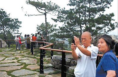 A man takes pictures with his mobile phone at Olympic Forest Park yesterday, the first day of a trial run. [China Daily] More Photos