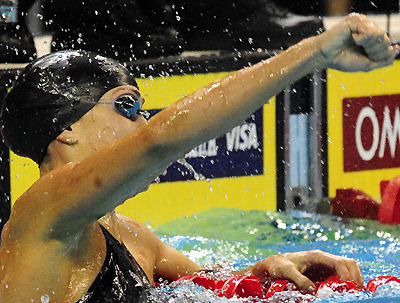 Natalie Coughlin celebrates her new mark in the 100m backstroke at the US Olympic swimming trials on Tuesday. [Xinhua]