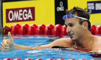 Aaron Peirsol celebrates to win the men's 100 metre backstroke setting a new world record time of 52.89 seconds at the U.S. Olympic Swimming Trials in Omaha, Nebraska July 1, 2008. [Agencies]