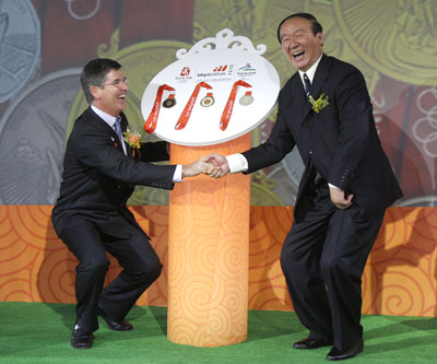 Vice President of the Beijing Organising Committee for the Olympic Games (BOCOG) Jiang Xiaoyu (R) laughs as he shakes hands with BHP Billiton China President Clinton Dines in front of the Olympic medals at an official handing over ceremony in Beijing July 3, 2008. [Agencies]