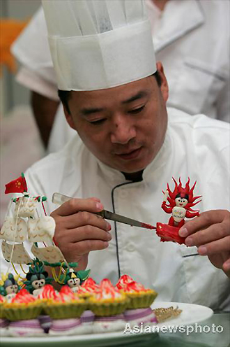 A chef works on his Olympic-themed course in Tianjin, July 2, 2008. More than 100 chefs in Tianjin participated in an Olympic-themed culinary competition. [Asianewsphoto]