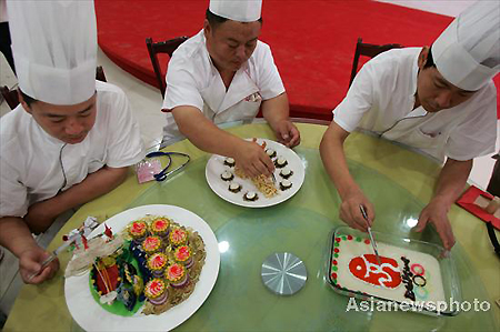 Chefs work on their Olympic-themed courses in Tianjin, July 2, 2008. More than 100 chefs in Tianjin participated in an Olympic-themed culinary competition. [Asianewsphoto]