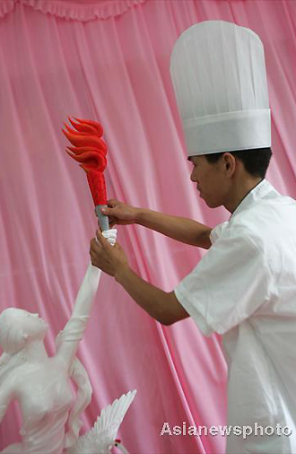 A chef works on his Olympic-themed course in Tianjin, July 2, 2008. More than 100 chefs in Tianjin participated in an Olympic-themed culinary competition. [Asianewsphoto]