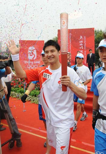 Former Olympic champion diver Tian Liang bears the Olympic flame during the Xi'an leg relay in Northwest China's Shaanxi Province July 4, 2008. [Xinhua]