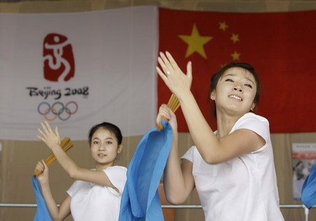 Members of professional cheerleading squad practise during a training session for the 2008 Beijing Olympic Games and Paralympic Games in Dachang County in Hebei province July 4, 2008. [Agencies]