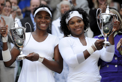 Serena and Venus (L) Williams of the US hold their trophies after defeating Lisa Raymond of the US and Samantha Stosur of Australia in their doubles finals match at the Wimbledon tennis championships in London July 5, 2008. [Agencies]