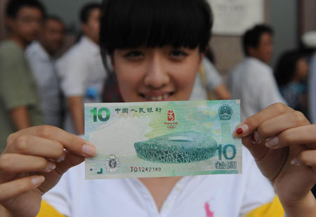 A Beijing citizen shows her commemorative Olympic bank note with a face value of 10 yuan. Five commercial banks in Beijing began to exchange the note from July 9, 2008. [Xinhua]