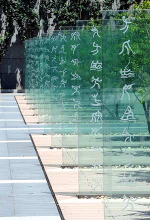 Photo taken on July 6, 2008 shows character symbols of games on glass screen walls at the man-made sinkage square in the Olympic Forest Park in Beijing, capital of China. [Xinhua]