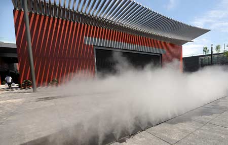 Photo taken on July 6, 2008 shows mirage sprayed from the ground in front of the south entrance of the man-made sinkage square in the Olympic Forest Park in Beijing, capital of China. The sinkage square is dubbed as "palace under ground", or "the corridor for traditional Chinese arts", which has seven "exhibition courtyards" like the ancient-styled Chinese palace gate, booth, chime, red walls in line, displaying traditional Chinese culture and arts to athletes and visitors from around the world. [Xinhua]