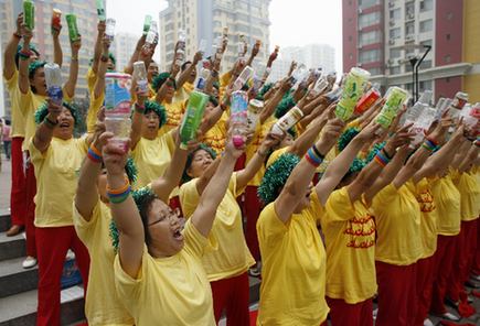 Members of the Huayi Cheerleading Team practise in their neighbourhood in Beijing July 11, 2008. The cheerleading team which members are between 49 and 73 years old, will cheer on the stands in the stadiums during the 2008 Beijing Olympic Games and Paralympic Games. [Agencies]