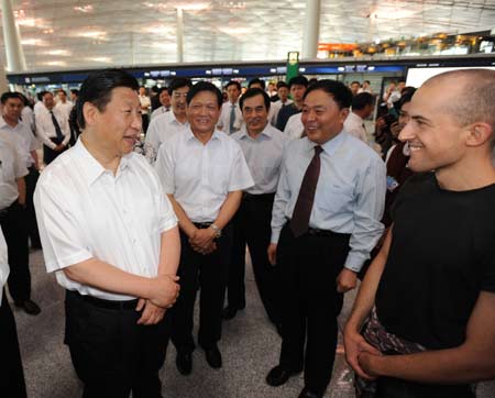 Chinese Vice President Xi Jinping (L front) talks with passengers in Terminal 3 of the Beijing Capital International Airport in Beijing, capital of China, July 12, 2008. [Xinhua]