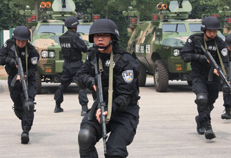 Officers and soldiers who are part of the Qinhuangdao division of the Beijing Olympic Games security take part in a training session to improve their ability to deal with emergencies, July 13, 2008. [Xinhua]