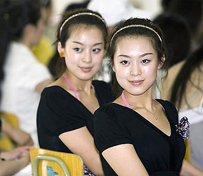 Twin sisters Li Xiaoye and Li Ziye, 19 years old, pose for a photo in Beijing in this file photo undated. The Li sisters will be among the 337 potential medal presenters for the victory ceremonies at the Beijing Games. [sohu.com.cn]