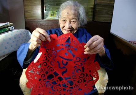 Hu Jiazhi, a 112-year-old artist in Nanjing shows off her masterpiece, July 15, 2008. It took her more than a month to finish three paper cuts. In each one, there is the Olympic Chinese seal, the five Olympic rings, lucky clouds and eight doves, which represent luck, peace and unity. The elderly artist will pick her favorite paper cut and present it to the Beijing Olympic Committee as a gift through the Nanjing Artists' Association.[Asianewsphoto]
