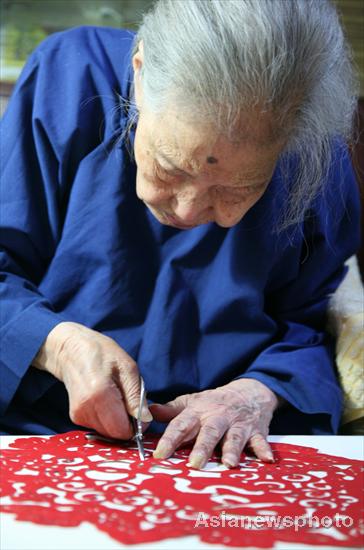 Hu Jiazhi, a 112-year-old artist in Nanjing makes a paper cut, July 15, 2008. It took her more than a month to finish three paper cuts. In each one, there is the Olympic Chinese seal, the five Olympic rings, lucky clouds and eight doves, which represent luck, peace and unity. The elderly artist will pick her favorite one and present it to the Beijing Olympic Committee as a gift through the Nanjing Artists' Association.[Asianewsphoto]