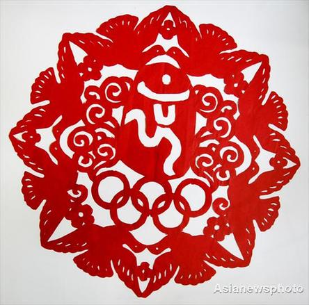A paper cut featuring the Olympic Chinese seal, the five Olympic rings, lucky clouds and eight doves, which represent luck, peace and unity, was created by Hu Jiazhi, a 112-year-old artist in Nanjing July 15, 2008. It took her more than a month to finish her masterpiece. The elderly artist will pick her favorite one and present it to the Beijing Olympic Committee as a gift through the Nanjing Artists' Association.[Asianewsphoto]