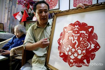 A member of the Nanjing Folk Artists' Association describes a papercut created by Hu Jiazhi, a 112-year-old artist, July 15, 2008. It took her more than a month to finish three paper cuts. Each one features the Olympic Chinese seal, the five Olympic rings, lucky clouds and eight doves, which represent luck, peace and unity. The elderly artist will pick her favorite one and present it to the Beijing Olympic Committee as a gift through the Nanjing Artists' Association.[Asianewsphoto]