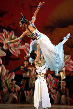 A male dancer holds up his partner as they perform the dance drama Xishi about one of the four prettiest women in ancient China, in the People's Hall in Wuxi, Jiangsu Province, July 13, 2008. The drama will be performed at the Tianqiao Theatre in Beijing in mid August as one of the dramas performed during the Olympics. [Xinhua]
