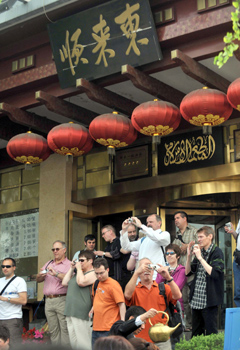 Foreign tourists take pictures in front of a restaurant in Beijing, May 1, 2008. [Xinhua]