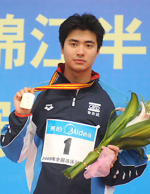 Wu Peng poses with his gold medal during the medal ceremony for the men's 200m national butterfly swimming final in Shaoxing April 2, 2008. [Xinhua]