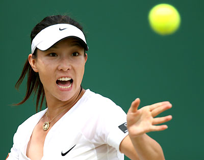 Zheng Jie reaches for the ball during her match at the Wimbledon tennis championships in London July 3, 2008. [Agencies]