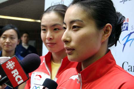 Guo Jingjing (Right) and her synchronized springboard partner Wu Minxia are interviewed after they win Diving Grand Prix Canada in this May 4, 2008 file photo. [Xinhua]