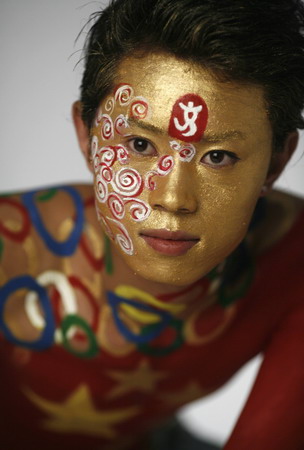A student of Mao Geping Image Design Art School, which specialises in make-up design teaching, has his picture taken in the photo studio of the school after painting his face and body with Olympic symbols in Beijing July 18, 2008. [Agencies]