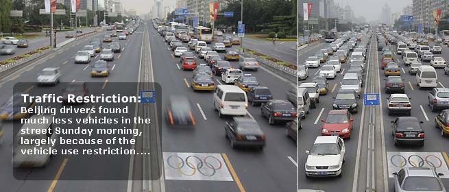 A combo pictures shows vehicles travel on the Beijing West 2nd Ring Road during rush hour on July 18, 2008 (bottom) and July 20, 2008. The lanes besides the central fence are reserved for Olympic traffic.Cars will be banned on alternate days depending on whether their license plates end in odd or even numbers. [Agencies]