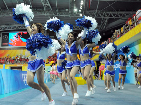 Beijing Olympic volunteers perform a cheerleading routine at the Beijing Institute of Technology Gymnasium during the briefing and pep rally for the Beijing Olympic and Paralympic Games, July 20, 2008. [Xinhua] Medal Presenters Outfits