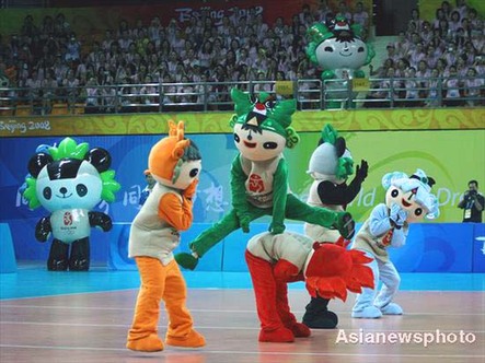 Volunteers dressed as Fuwa, the Beijing Olympic mascots, perform at the Beijing Institute of Technology Gymnasium during the briefing and pep rally for the Beijing Olympic and Paralympic Games, July 20, 2008. [Asianewsphoto] Medal Presenters Outfits