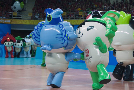 Volunteers dressed as Fuwa, the Beijing Olympic mascots, performat the Beijing Institute of Technology Gymnasium during the briefing and pep rally for the Beijing Olympic and Paralympic Games, July 20, 2008. [Asianewsphoto] Medal Presenters Outfits