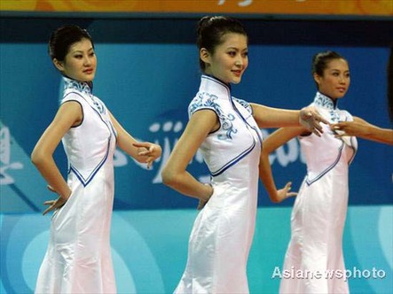 Would-be hostesses at the Olympics and Paralympics' medal ceremonies pose at the Beijing Institute of Technology Gymnasium during the briefing and pep rally for the Beijing Olympic and Paralympic Games, July 20, 2008. [Asianewsphoto] Medal Presenters Outfits