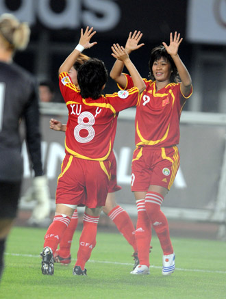 Members of the Chinese women’s soccer team high-five each other during a match against New Zealand. China beat New Zealand 1-0 in Qinhuangdao on July 20, 2008. [Xinhua]