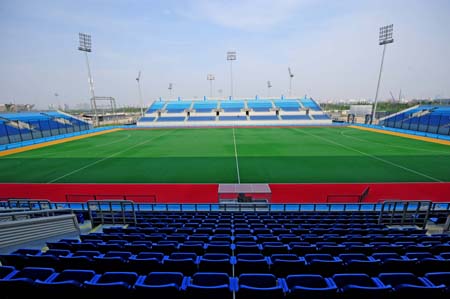 The stand and the field of the Olympic Green Hockey Field in the south of the Olympic Park is seen in this picture taken on May 16, 2008. This Field will host the hockey games of the Olympics and the soccer games of the Paralympics. [Xinhua]