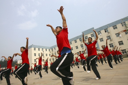 Students from the Tagou martial arts school from Henan province practise at a training base on the outskirts of Beijing July 16, 2008. More than 2,000 students from Tagou martial arts school will perform during the opening ceremony of 2008 Beijing Olympic Games and have been training on the outskirts of Beijing for a year, local media reported. Picture taken July 16, 2008. [Agencies]