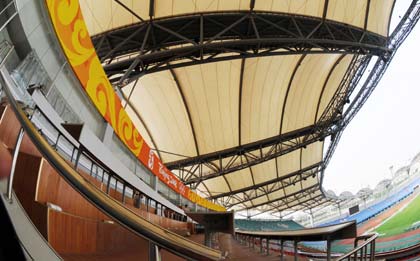 The stand of Qinhuangdao Olympic Center Stadium in Qinhuangdao, one of the six co-hosting cities in North China's Hebei Province, is seen in this picture taken on July 18, 2008. The venue will host 12 football events during the Olympics. [Xinhua]