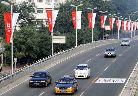 Cars with even number plates travel on a road in Beijing, July 20, 2008. [Agencies]