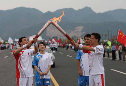 Luis Hong-Sanchez from Venezuela (first right) gets his torch lit by another bearer.