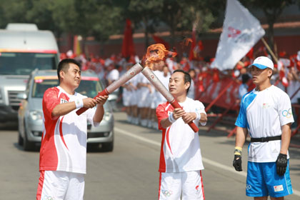 Yoshitoshi Mizuya from Japan (center) gets his torch lit from another bearer.