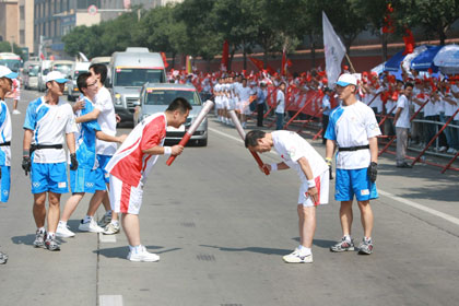 Yoshitoshi Mizuya from Japan (second right) and another bearer bow to each other.