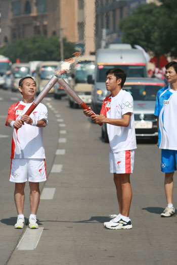 Yoshitoshi Mizuya from Japan (left) lights the torch of another bearer.