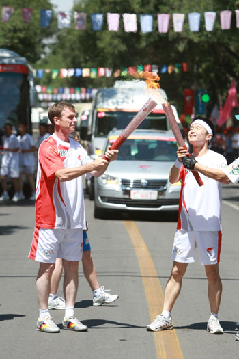 Werner Ebel from Germany (left) lights the torch of another bearer.