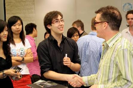 Quebec-native Carlo Aspri chats with a fellow French-speaker following his debut performance at the Yamaha Performance Music Centre in Liufang district on Saturday. [Photo by Marc Checkley/chinadaily.com.cn]