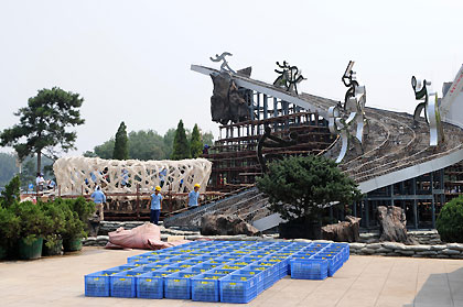 Workers build the framework in the shape of the Bird's Nest where flowers will be placed, on Tian'anmen Square in Beijing, July 22, 2008. The flowers will be kept on the square until the National Day holidays end on October 7. [Xinhua]