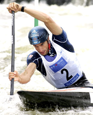 France's Tony Estanguet competes to win the C1 men's race at the ICF Canoe/Kayak Slalom Racing World Championships 2006 in Prague in this August 6, 2006 file picture. Double canoe Olympic champion Estanguet will carry the French flag at the 2008 Beijing Olympics opening ceremony. [Agencies]