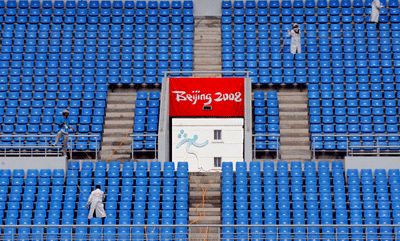 Several workers inspect audience seats in the Shenyang Olympic stadium, in one of the six co-host cities in Northeast China's Liaoning Province, in this picture taken July 22, 2008. The newly built venue will host 12 football events during the Olympics.