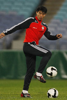 China's national soccer team member Zheng Zhi practices during a training session at the Olympic stadium in Sydney June 19, 2008. [Agencies]