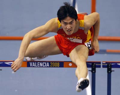 China's Liu Xiang competes to win the men's 60m hurdles final at the 12th IAAF World Indoor Athletics Championship in Valencia March 8, 2008. [Agencies]