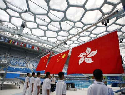 Volunteers practice raising flags for the medal ceremony in the National Aquatic Center, also known as the Water Cube in the run-up to the Olympics in Beijing July 23, 2008.[Agencies]