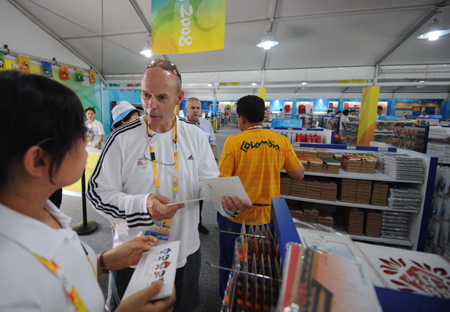 A foreigner who has moved to the Olympic media village selects pieces of Olympic memorabilia in the Village July 24, 2008. The biggest media village in Olympic Games history officially opened in northern Beijing on Friday morning. [Xinhua]
